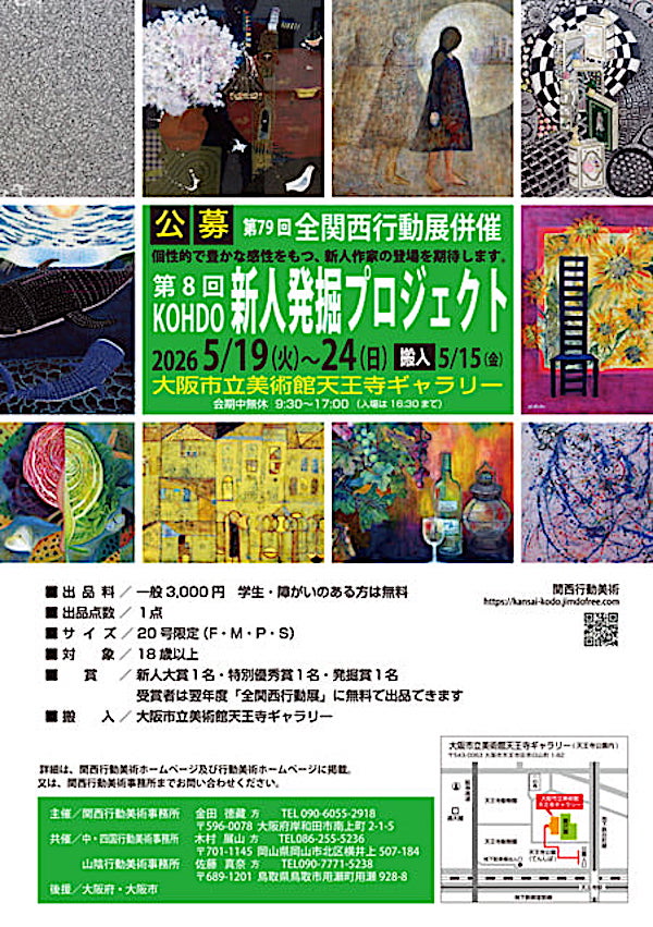 ☆公募☆第79回全関西行動展・第8回新人発掘プロジェクト 2026.03.02 お知らせ 2026年5月19日(火)~5月24日(日)◆搬入受付5月15日(金)大阪市立美術館天王寺ギャラリー>詳しくはこちらから関西事務所のサイトを御覧ください